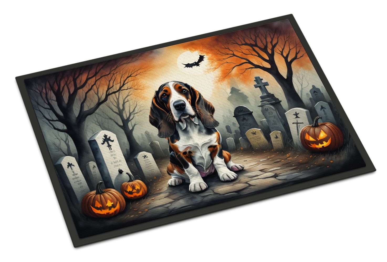 Doormat featuring breed specific Basset Hound artwork. Celebrate Halloween with this Halloween Doormat. Welcome your guests in style with our Artwork Door Mat, designed to withstand almost any weather condition. This mat, measuring approximately 18 by 27 inches, is held together by durable black binding tape. Its top layer, composed of polyester felt, is dyed with the eye-catching image you see on the mat. A few layers below provide the mat with stability, while its rubber bottom is stamped to help prevent slipping and ensures safety. Our mat works wonderfully as both an indoor or outdoor door mat. For cleaning, simply hose it off with water or use a power washer - no need for any cleaner that produces suds. Avoid scrubbing with a brush, instead, opt for the vacuum on floor setting. Designed manufactured and printed in the USA, this mat is a perfect addition to your porch, outdoor kitchen, entryway, or any indoor space. Its unique design makes it a charming decorative rug that greets your guests and adds a stylish touch to your home decor.