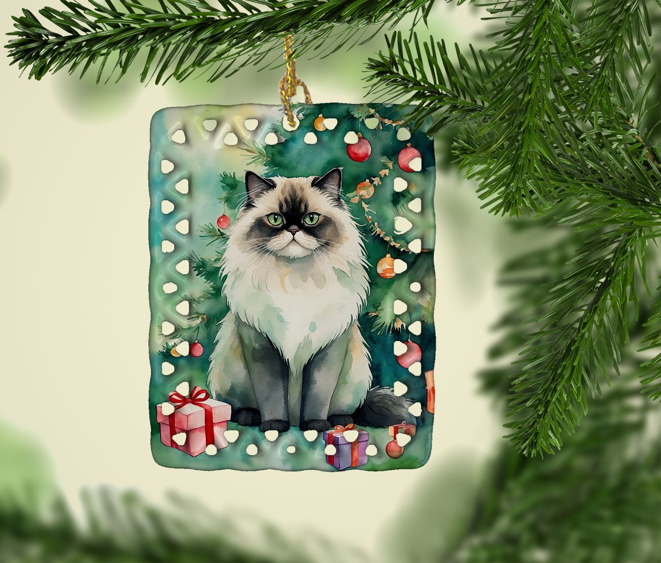 Porcelain Ornament featuring breed specific Himalayan artwork. Celebrate Christmas with this Christmas Ornament. Add a unique, personal touch to your holiday decor with our Rectangular Lattice Porcelain Ornament. Perfect for creating cherished memories, this high-quality ornament shines under festive lights, reflecting warmth and joy throughout your Christmas tree. Crafted with a glossy finish, it showcases vibrant, full-color artwork contributed by our talented artists, ensuring your tree is adorned with a burst of color and holiday spirit. What sets this Porcelain Ornament apart is its customizable white back. Use a paint pen or permanent marker to write a heartfelt message, commemorate a special year, or mark an unforgettable date, turning this ornament into a keepsake that will be treasured for years to come. For best results, allow any personalization to dry thoroughly before handling. Each ornament comes complete with a delicate gold cord, making it easy to hang and display. Proudly made in the USA, this ornament measures 3.375 x 2.625 inches and is a thoughtful gift for pet sitters, teachers, family members, or anyone who would appreciate a little extra holiday magic. Bring style, charm, and a touch of personal meaning to your Christmas tree with this beautifully designed ornament..