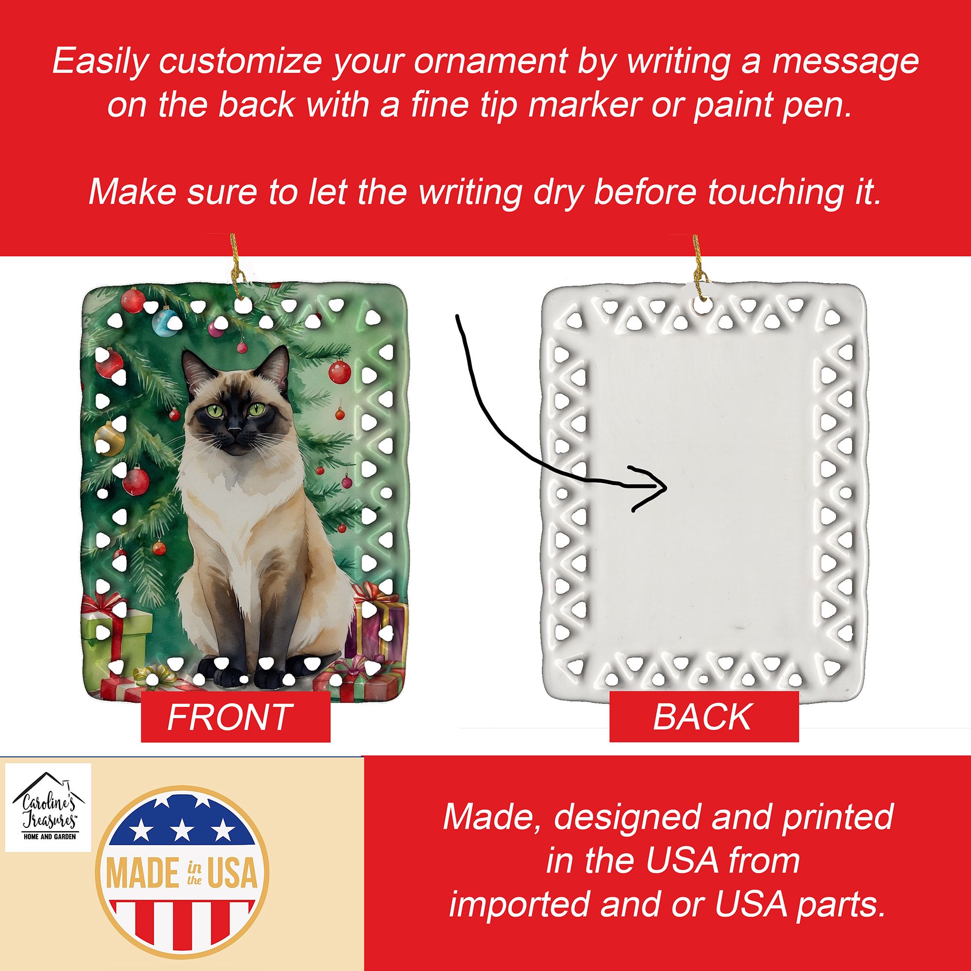 Porcelain Ornament featuring breed specific Birman artwork. Celebrate Christmas with this Christmas Ornament. Add a unique, personal touch to your holiday decor with our Rectangular Lattice Porcelain Ornament. Perfect for creating cherished memories, this high-quality ornament shines under festive lights, reflecting warmth and joy throughout your Christmas tree. Crafted with a glossy finish, it showcases vibrant, full-color artwork contributed by our talented artists, ensuring your tree is adorned with a burst of color and holiday spirit. What sets this Porcelain Ornament apart is its customizable white back. Use a paint pen or permanent marker to write a heartfelt message, commemorate a special year, or mark an unforgettable date, turning this ornament into a keepsake that will be treasured for years to come. For best results, allow any personalization to dry thoroughly before handling. Each ornament comes complete with a delicate gold cord, making it easy to hang and display. Proudly made in the USA, this ornament measures 3.375 x 2.625 inches and is a thoughtful gift for pet sitters, teachers, family members, or anyone who would appreciate a little extra holiday magic. Bring style, charm, and a touch of personal meaning to your Christmas tree with this beautifully designed ornament..