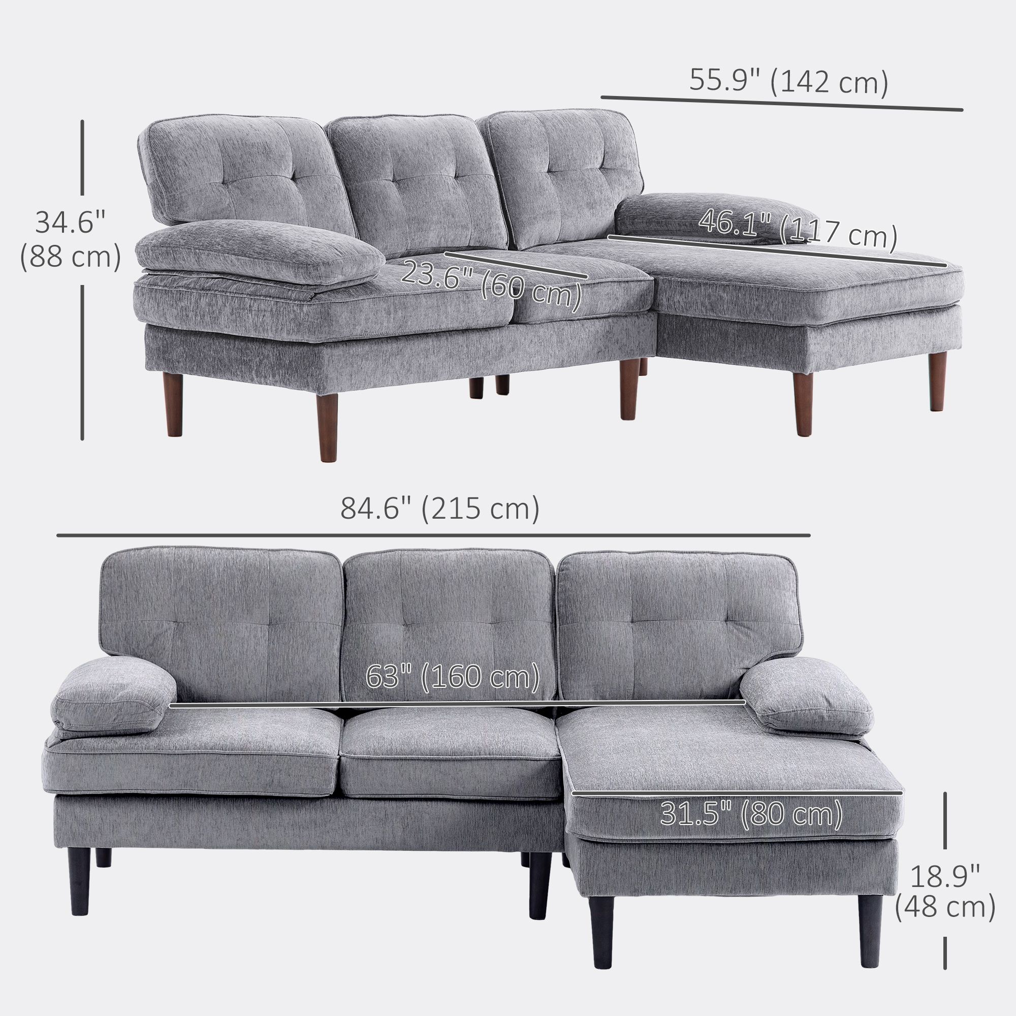 • Corner Sofa Information: Overall Dimensions: 84.6" W x 55.9" D x 34.6" H (215 x 142 x 88 cm). Chaise Lounge Size: 31.5" W x 46.1" D x 18.9" H (80 x 117 x 48 cm). Max Load: 550 lb. (250 kg). Assembly is required.