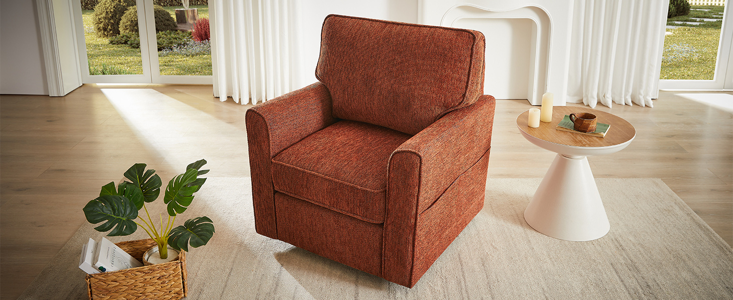 This 360-degree swivel armchair combines style, comfort, and functionality in one sleek design. Upholstered in soft and durable chenille fabric, it offers a luxurious feel while being easy to maintain. The chair's ergonomic structure ensures maximum support for the back and arms, providing comfort during extended use. Its convenient side storage pockets offer a practical solution for organizing small items like magazines or remotes, keeping your space tidy. With its modern, rounded armrests and compact size, this chair fits perfectly into smaller spaces without compromising on comfort. Ideal for any room, it brings both elegance and functionality to your home or office.