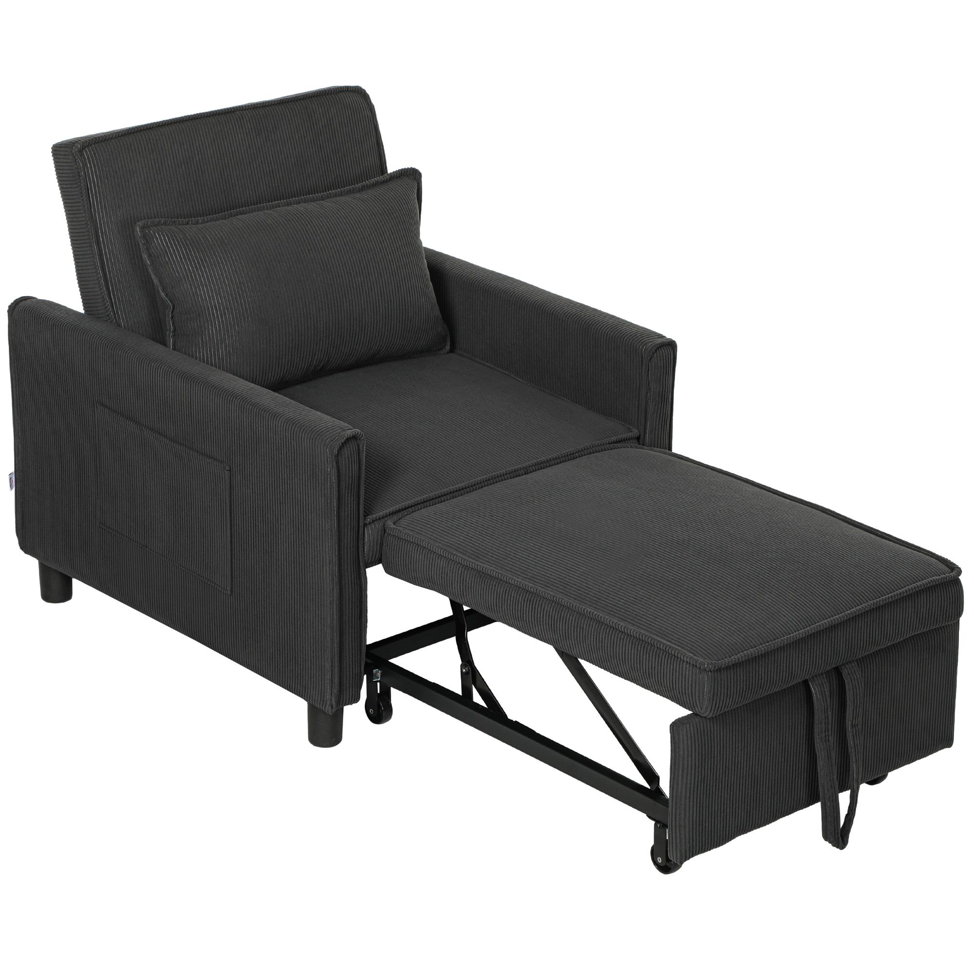 Take a seat and relax your way. Go for this HOMCOM pull-out bed! Effortlessly switch from a lounge chair or a recliner to a convertible bed with the pull-out strap and wheels. Enjoy the comfort of adjustable back positions up to 180° and the cozy touch of corduroy upholstery with thick foam padding, pillow, and springs. Sit back and relax in the HOMCOM folding bed.
