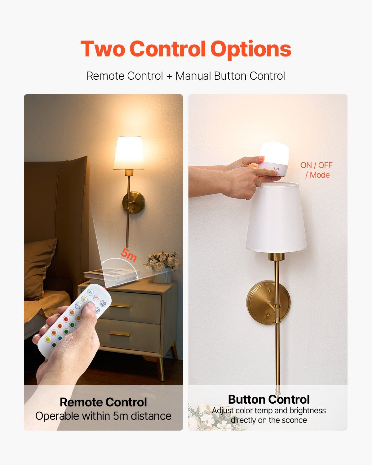 5.2 Control Options: This rechargeable wall lights provide both remote control (up to 5 meters) and manual button control. Whether you prefer to adjust the light remotely or directly, it ensures a convenient lighting experience to fit your needs seamlessly.