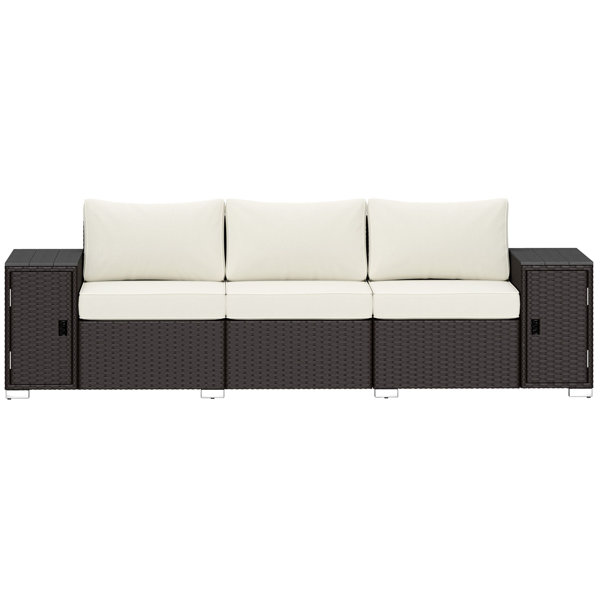 Upgrade your outdoor space with the Outsunny three-seater wicker patio couch. Enjoy a spacious rattan sofa with thick seats and back cushions that offer superior comfort. Additionally, the wide armrests can double as small side tables with convenient storage space underneath. The steel frame wrapped in UV-resistant PE rattan protects this balcony couch from the elements, while the splash-resistant, zippered cushion covers make cleaning up a breeze. Get out, get comfy, and get Outsunny!