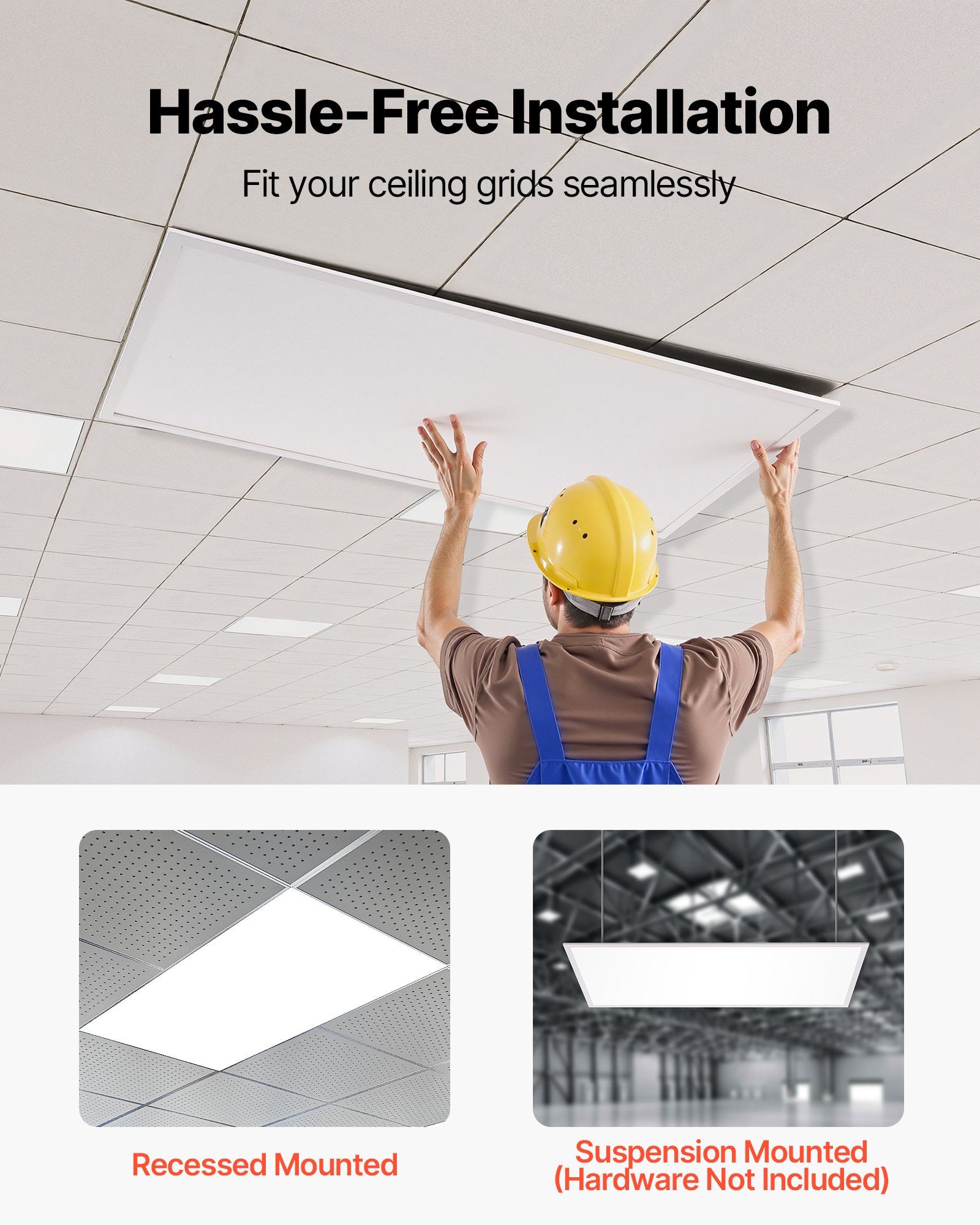 2.Adjustable Color & Brightness: Choose from 4000K/5000K/6000K color temperatures and 30W/40W/50W brightness levels using the built-in side switch-no need to disassemble the LED drop ceiling light. Compatible with 0–10V dimmers (dimmer not included)