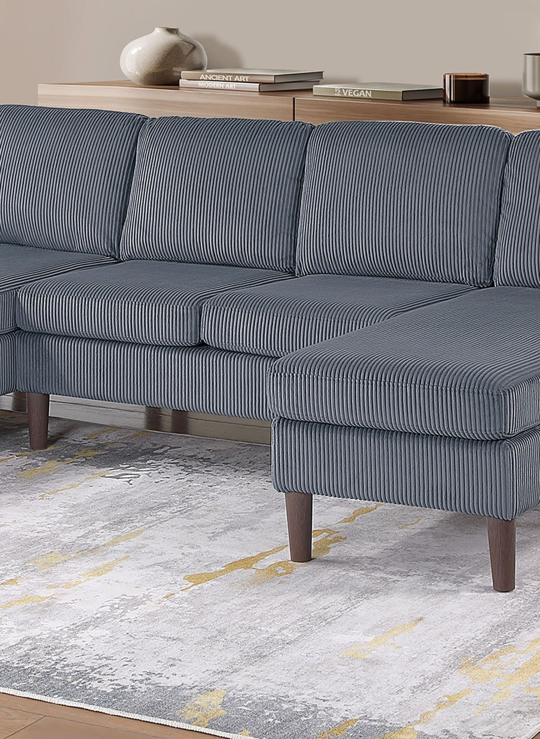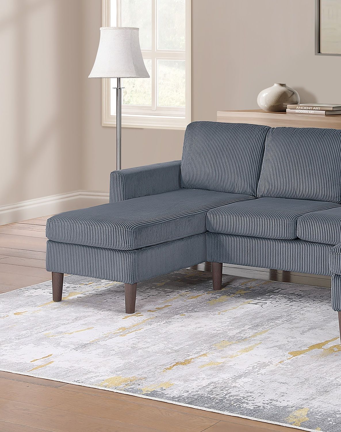 Enhance your home with the perfect combination of modern elegance and cozy relaxation. The dual chaises on either side create the ultimate relaxation zones, allowing multiple people to lounge at once without feeling crowded. Whether you're stretching out with a good book, enjoying a movie night, or entertaining guests, this sectional adapts effortlessly to your lifestyle. The armless two-seater section in the middle keeps the layout open and seamless, making the sectional feel even more spacious. Wrapped in soft and textured corduroy fabric, the sectional provides a plush, inviting feel that enhances both comfort and style. The deep ridges of the corduroy upholstery not only add a sophisticated touch but also create a warm and cozy atmosphere. The durable material ensures longevity, making it an excellent choice for everyday use. With its modern silhouette, the sectional features sleek square arms that give it a structured and contemporary look. With its luxurious corduroy upholstery, modern square arms, elegant tapered legs, and dual chaise seating, this sectional delivers the perfect combination of contemporary design and inviting comfort.