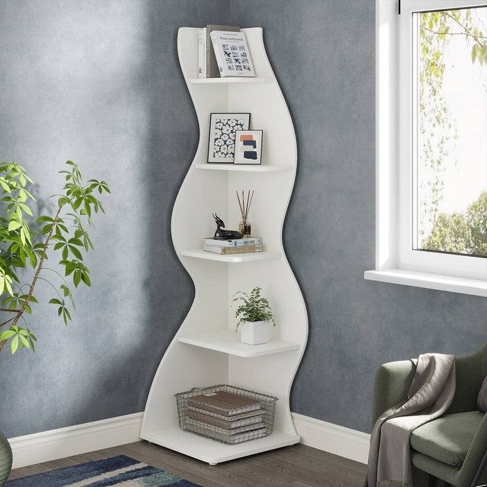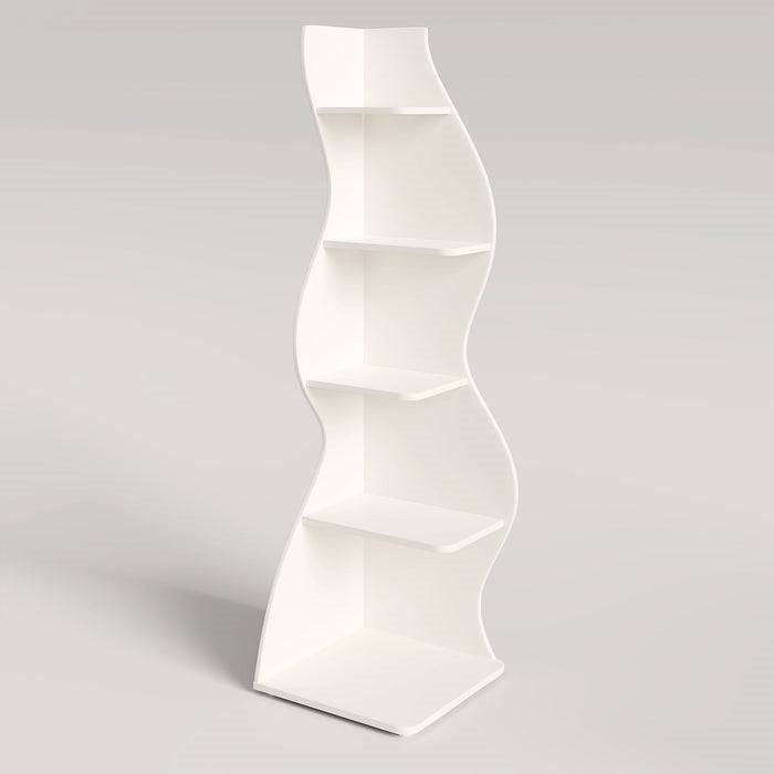 Introducing this stunning Modern Whimsical 5 Shelf Corner Bookcase Stand Wood Finish, a contemporary 5-tier shelving unit fitting for any home or office corner. Its colored finish and sea grass-inspired design render it both fashionable and practical. Manufactured from top-tier board material, its sleek form enhances any space. Providing copious storage, it's perfect for compact areas, offering organization without excess clutter. With easy assembly and adjustable shelves for optimal convenience, its neutral white hue and stylish design pair well with any décor, lending sophistication to your room.
