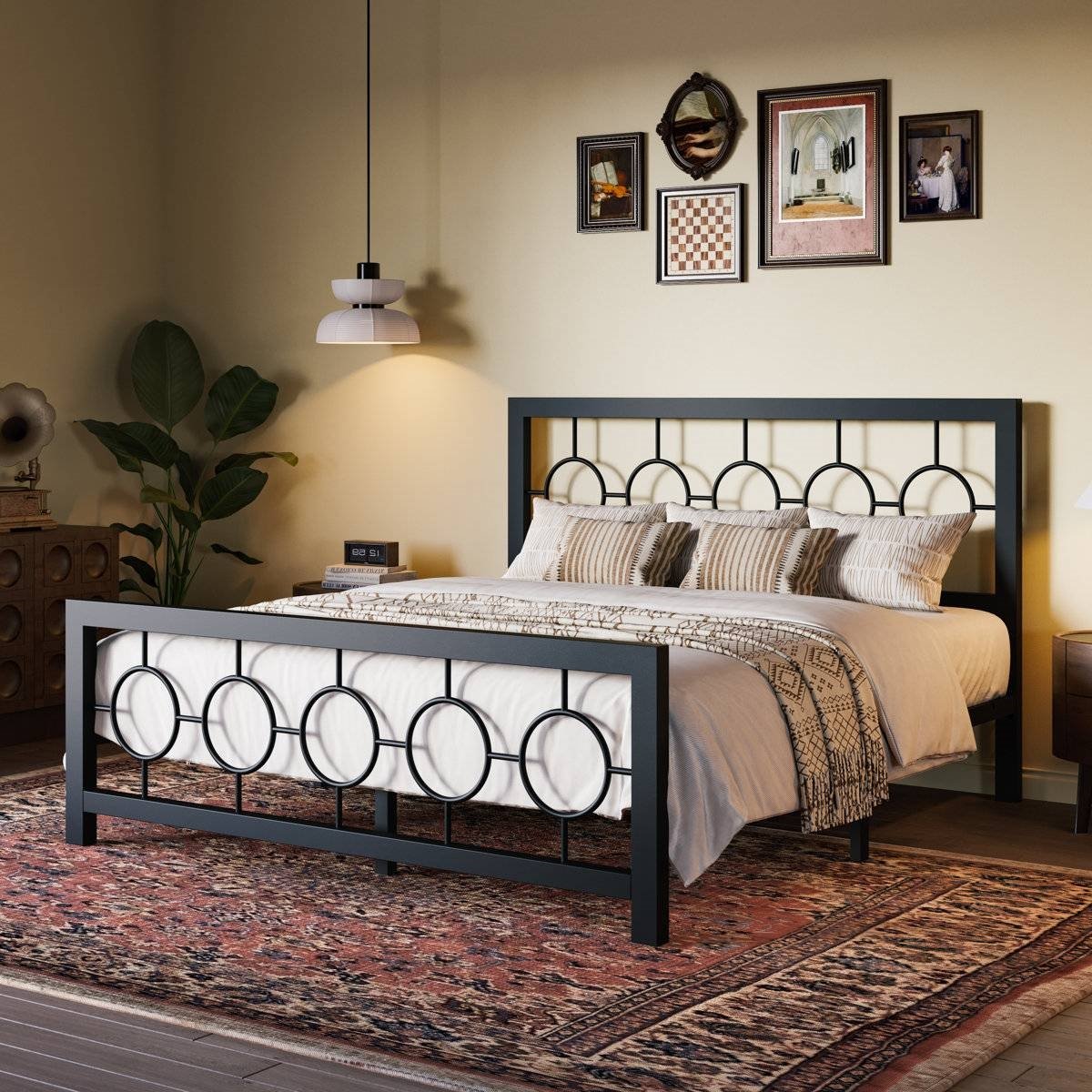 Crafted from robust iron material, this bed is highly resistant to scratches and heat and can be easily cleaned! Clean-lined and full of sleek modern style, this platform bed is just the right addition to center your sleeping space. It has a metal frame with a bold, solid finish, and it rests on four understated legs. Both the headboard and footboard strike rectangular silhouettes and feature circle medallion openwork for a nod to Art Deco and vintage elements. A series of slats eliminates the need for a box spring, so all that's left to get is a mattress of your choice (sold separately).