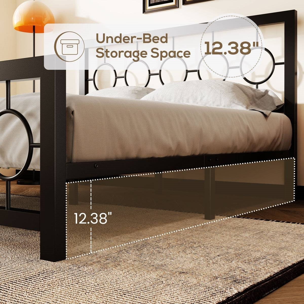 Crafted from robust iron material, this bed is highly resistant to scratches and heat and can be easily cleaned! Clean-lined and full of sleek modern style, this platform bed is just the right addition to center your sleeping space. It has a metal frame with a bold, solid finish, and it rests on four understated legs. Both the headboard and footboard strike rectangular silhouettes and feature circle medallion openwork for a nod to Art Deco and vintage elements. A series of slats eliminates the need for a box spring, so all that's left to get is a mattress of your choice (sold separately).