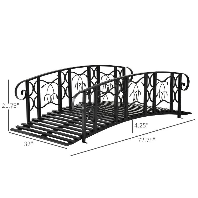 This Outdoor Vintage Black Metal Arch 6-ft Garden Bridge with Side-Rails features safe rails and adds charming antique décor to your backyard stream, creak, fish pond, or walkway. A centerpiece for your landscape, watch as the antique vine motifs and scrollwork shapes draw in eyes, and put the cherry on top of your zen garden. Landscaping your garden doesn't have to be garish, have form, and function with this steel footbridge.
