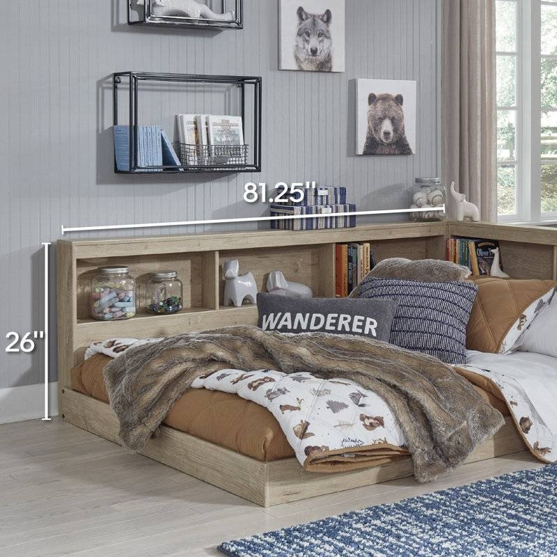Ideal for avid young readers, this Corner Bookcase Headboard Storage Platform Floor Bed makes it easy to grab your favorite book from the comfort of your mattress. Crafted from solid and engineered wood, this corner bed is a smart, space-saving choice that brings a big style to small living areas. The integrated storage headboard and bookcase side rails work wonders for calming clutter, while the innovative design lets you flip the configuration to suit your space. This headboard even includes 2 slim-profile USB charging ports. Plus, you can add your preferred mattress (sold separately) without the need for a box spring.