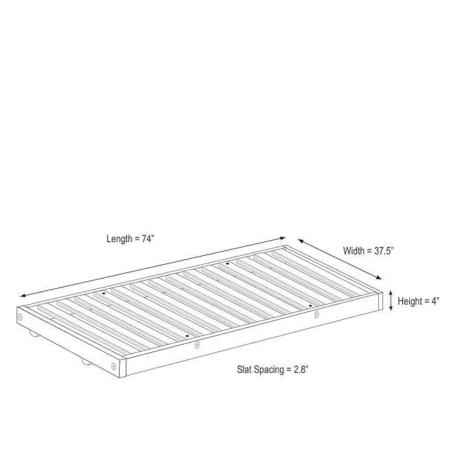Voted New York Times Wirecutter top pick for platform beds under $600, the Twin size Solid Wood Roll-Out Trundle Bed Frame - Made in USA is considered a minimalist Swedish design with an emphasis on functionality and simple, clean lines. This bed frame features a slat spacing of 2.8 inches, slats flush with the tops of the rails, and a platform height of 15 inches. For optional platform heights please see our leg length options available in the accessories section. Like all of our beds, this frame can support up to 600 pounds.