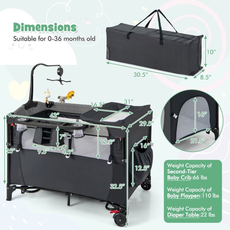 • Including one 5-in-1 Baby nursery center, 1 Storage tray, 1 Music and toy rack, 1 Diaper changing table,1 Mattress, 1 Safety strap, 2 Rocking tubes and 1 User manual