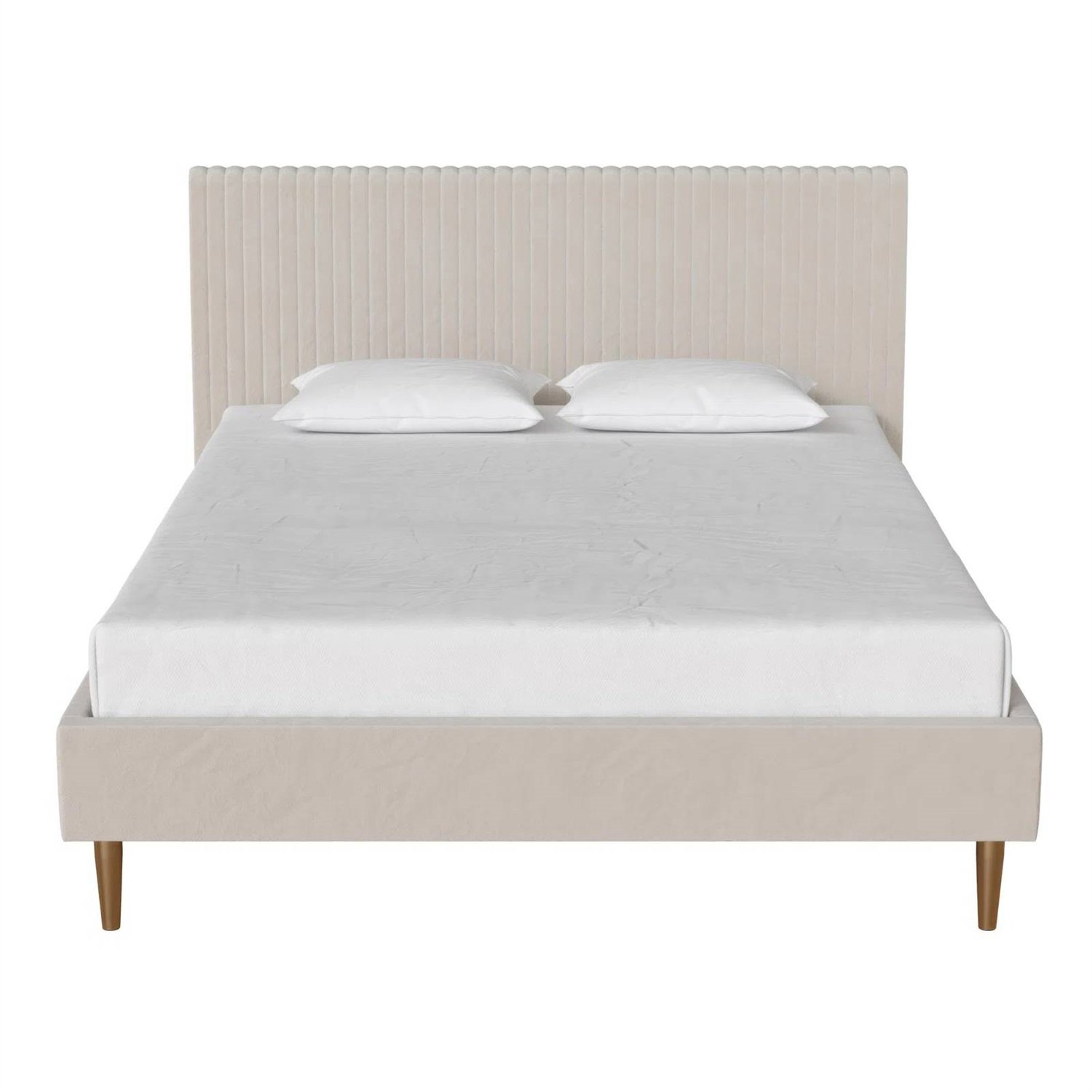 • Designed with tight channel tufting on the headboard and brass-tone tapered metal legs.