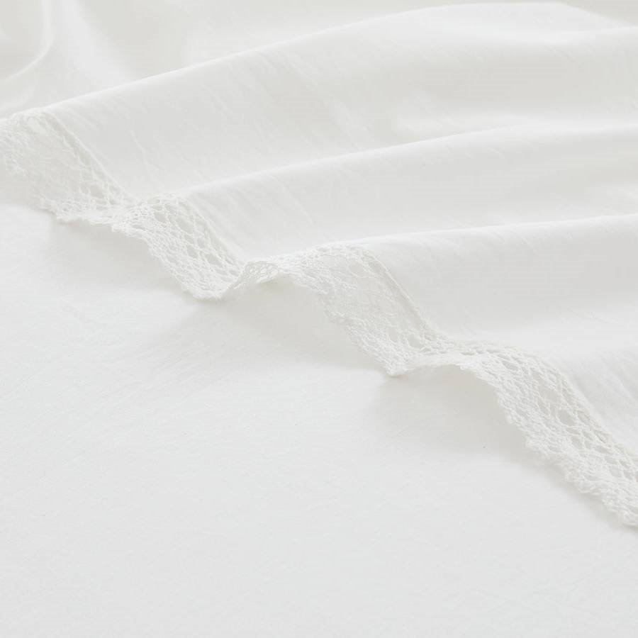 A little lace goes a long way! These white bed sheets bring effortless style to your bedroom decor. Their simple design makes them versatile for any decor theme, while the delicate lace trim adds a touch of charm. Perfect for farmhouse or coquette style homes, this cozy sheet set combines a solid color base with a beautiful accent. Made with 100% cotton for a lightweight, breathable feel. This 4 piece set includes 1 flat sheet, 1 fitted sheet, and 2 pillowcases. Machine washable for easy care.