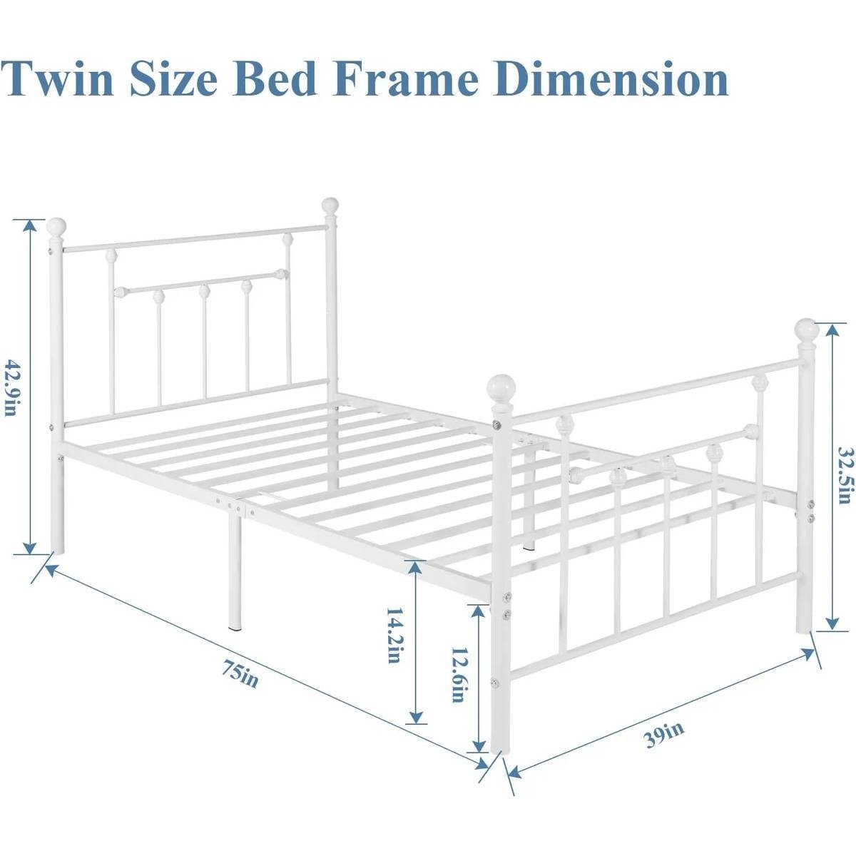 This Twin Victorian Style White Metal Platform Bed Frame with Headboard Footboard combines clean lines, a matte black metal frame, and antique-style castings result in a metal platform bed with a headboard and footboard that exudes the classy character and touch of vintage style your bedroom is yearning for. Upgrade square metal steel structure reduces friction with the mattress, solve noise problem, mattress is embedded in steel frame to avoid sliding or wobbling. Supported by 11 metal bars, 9 metal legs, this bed frame will stand the test of time. With anti-scratch foot cover, which can protect your floor from scratching. Raised H-shaped headboard and footboard , can accommodate suitable for any thickness and material mattresses. under the frame space is 12.6" and offers extra storage space. Package including all parts, tools, and assembly instructions of the bed, an adult can handle in under an hour.