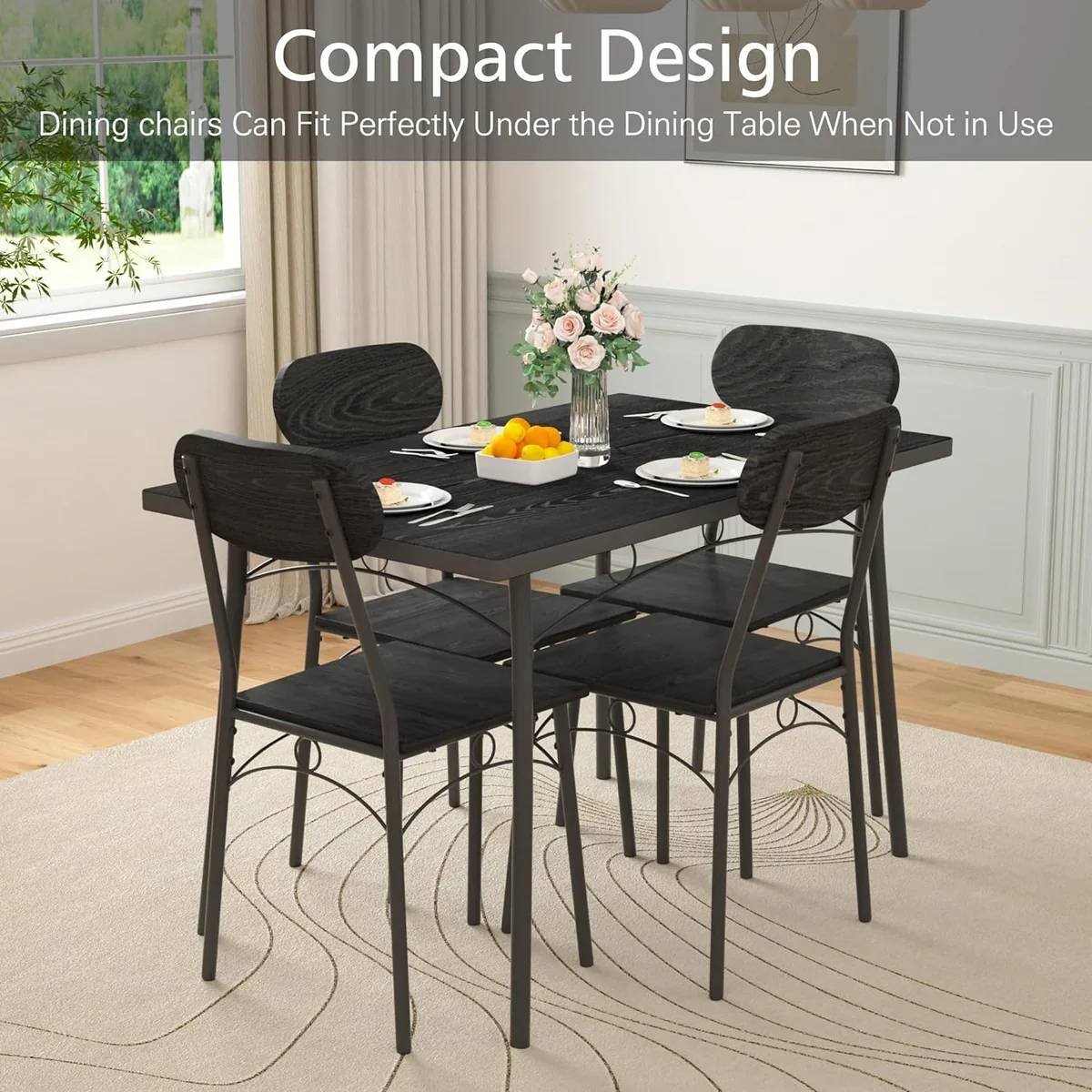 This Modern 5-Piece Dining Set with Black Wood-Top Table and 4 Chairs is elegant and simple, not only can perfectly blend with any style of home decoration but add a sense of fashion to your space. Our dining table set is functional yet unobtrusive, with backrest slots perfectly in line with the table edge which saves even more space. Make it perfect for your kitchen, dining room and breakfast nook. Made of MDF and metal frame, this table and chair set is strong enough to be used for a long time. The surface of the iron pipe is painted, which not only increases the rust resistance but strengthens the stability. This table has a 185-pound weight capacity that's great for eating dinner, working on your laptop, or playing games with friends and family. Following product instructions, you can complete the installation in minutes. The rust-proof material works perfectly in extending the serving cycle and simplifies the cleaning as well.
