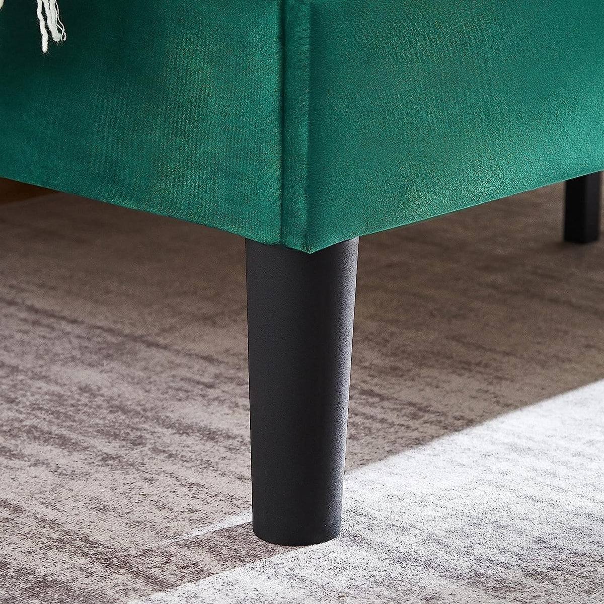The Queen size Green Upholstered Platform Bed Frame with Headboard provides dense and strong support because it contains 12 pcs of wooden slats and a metal frame. The center support legs can prevent the bed mattress from sagging and extend the life of your mattress. Queen size supports a maximum weight capacity of 800 pounds. The height-adjustable panel headboard ranges from 43.7" to 47.63", suitable for any thickness and material mattresses, you can adapt it to the optimal height for your needs. The mattress can be put on the bed frame slats directly, Abandon box springs, and you can save more money and time. This upholstered bed frame is suitable for all kinds of mattresses, spring, memory foam, latex, or hybrid mattresses. The sturdy and noise-free frame use foam padding inside. Also with strong support legs to enjoy every silent second for a good night's sleep or while resting for the perfect noise-free bed frame. The headboard of the bed is filled with a sponge, full and not easy to collapse. The resilience brought by the sponge fits the body and can effectively reduce the pain of daily bumps.