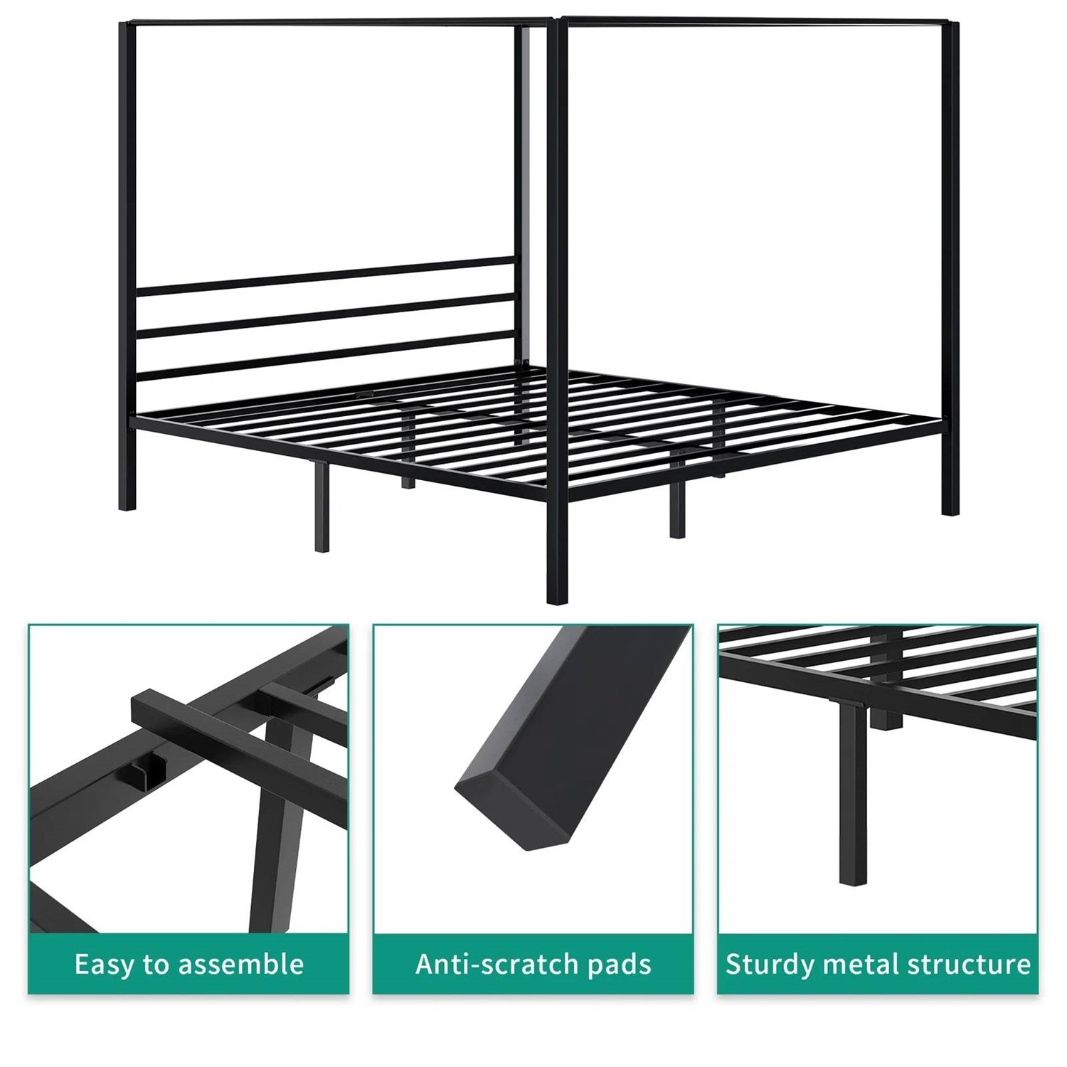 Queen size Modern Four Poster Metal Canopy Bed in Black Finish
