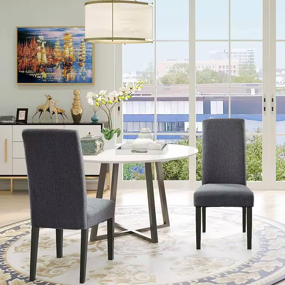 Easily upgrade your kitchen with this Set of 2 Modern Grey Fabric Upholstered Dining Chair with Black Wood Legs. Featuring upholstery, the chairs are available in a range of colors to complement your decor. The clean, armless design elevates any space with timeless panache. The chair is covered with fabric material and padding with wooden legs making it more solid with a modern style.