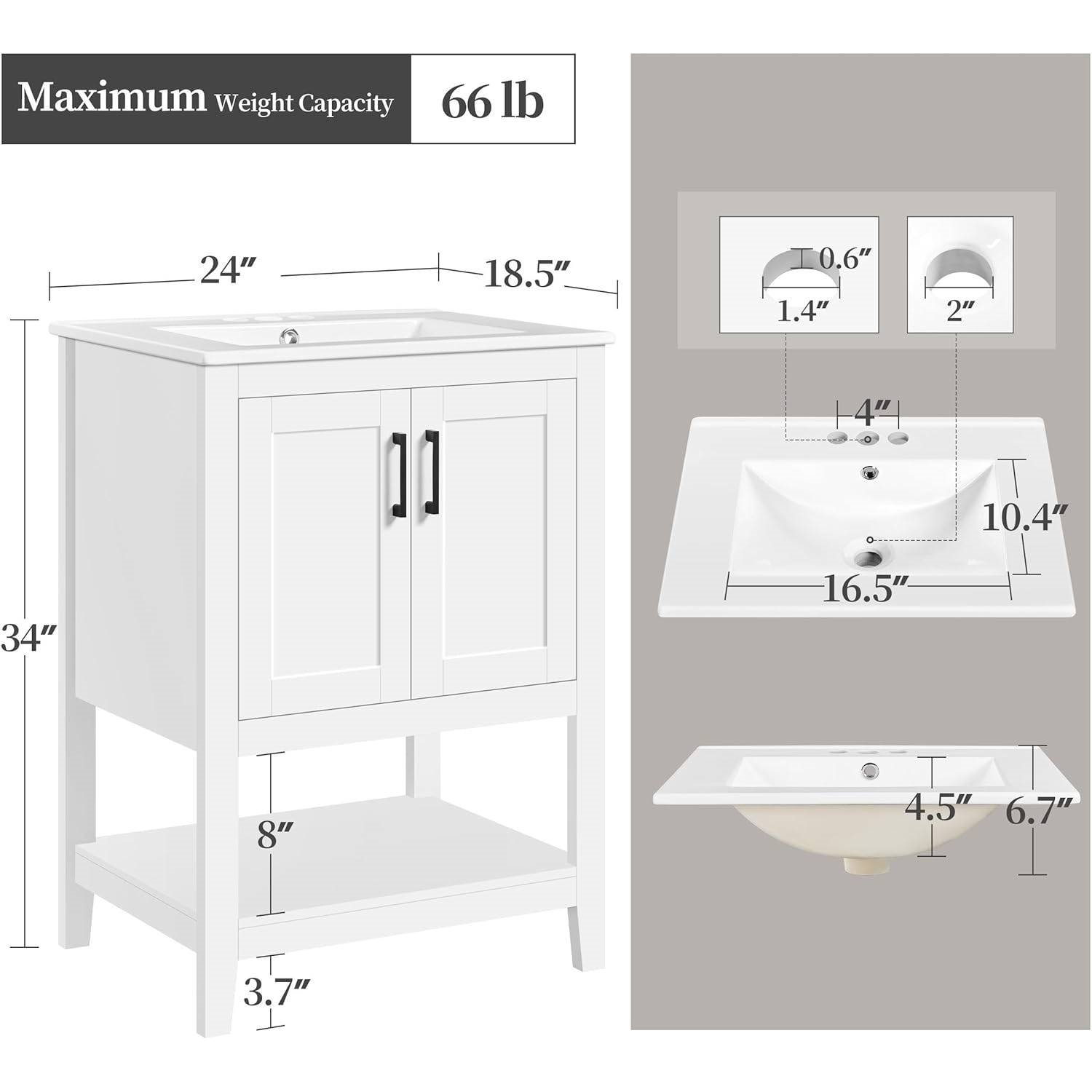 Crafted from solid ceramic, the Modern White Wood Bathroom Vanity with White Ceramic Sink has an overflow and three tap holes for added convenience. The 2-door cabinet interior under the ceramic basin provides sample space for installing pipes or storing some towels, soaps, hats, shampoos,and other items. This 34" tall bathroom vanity is constructed with CARBP 2-compliant MDF and features a freestanding ceramic sink, ensuring robustness and long-lasting quality without the possibility of cracking. The ceramic basin and the shelf have a maximum weight capacity of 66lb.The freestanding floor cabinet is robust enough to support the weight of yourdaily essentials, please refrain from placing excessively heavy items on the shelves. The ceramic material is resistant to water and can endure exposure to water without deteriorating or distorting. The painted surface finish of the entire structure is easy to clean with a damp cloth, enabling effortless maintenance to keep it smooth and shining. This storage cabinet, featuring a 2-door cabinet and an open shelf,assists in organizing your sundries, providing a tidy space. The elegant white design, complemented by two metal handles, bestows a stylish look that seamlessly fits with any decor.
