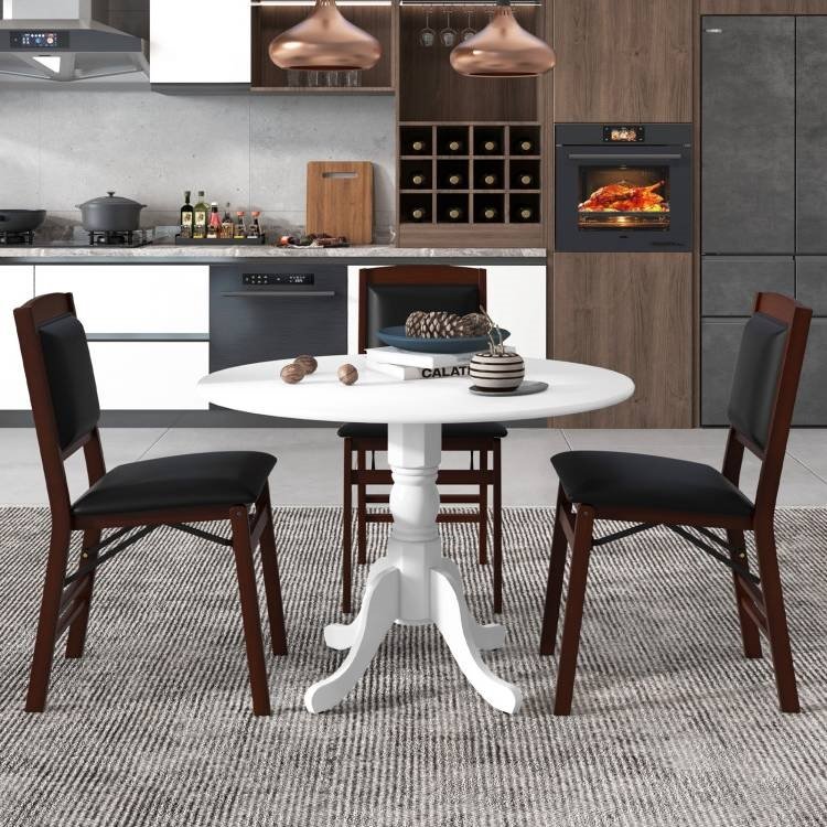 Crafted with natural rubber wood, the Round Solid Wood Kitchen Dining Table in White Farmhouse Wooden Finish is solid, not easy to crack and deformation-resistant for prolonged lifespan. Moreover, been through exquisite workmanship, it is smooth and burr-free. The white wood finish and elegant curved trestle legs make this dining table a stunning addition to your home. Hence, the dining table can easily blend with various decor themes to improve the style of your living room, kitchen, and dining room. The rustic dining table comes with stable splayed legs, which ensures excellent stability. Additionally, each leg is equipped with adjustable feet pads, thus the dining room table will not wobble on uneven grounds. This dining table can accommodate up to 4 people, making it the perfect choice for small family gatherings. In addition, the thoughtful round corners are designed to avoid scratching or bumping. Equipped with detailed instruction and numbered parts, the assembly of the dining table will not trouble you. With a healthy paint finish, the dining table can be easily cleaned with a wet cloth.