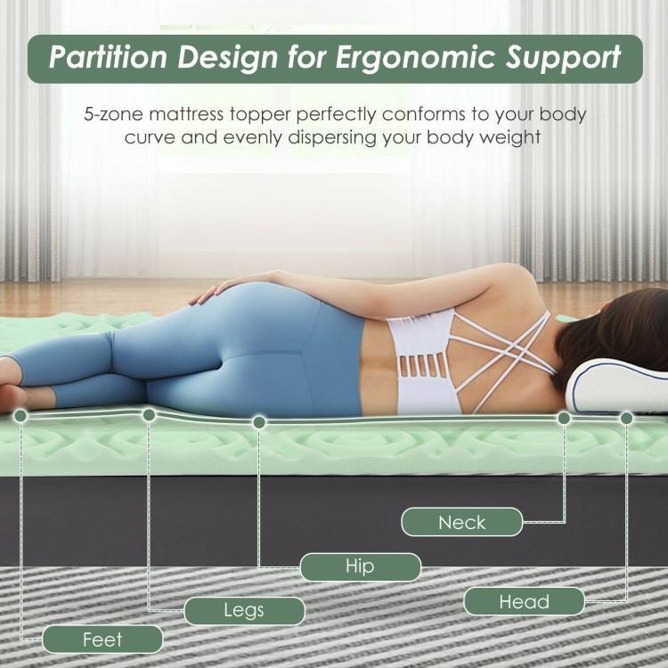 • Ergonomic 5-Zone Design: This mattress topper perfectly conforms to your body curve at the correct positions by dispersing your body weight evenly. It provides better support for major body zones, including the head, shoulders, back, hips, legs, and feet. The mattress topper can effectively eliminate fatigue and reduce body pain.