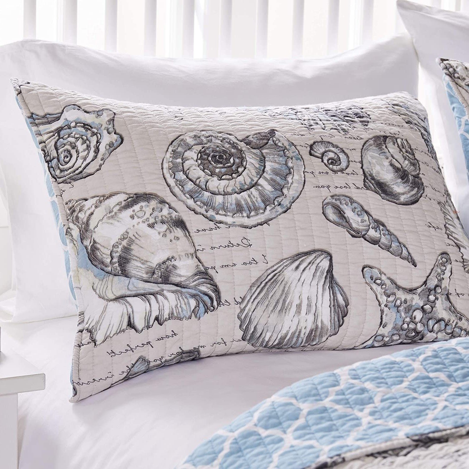 Time for a bedroom beach escape makeover! Beach scenes and fresh ocean breezes are brought to mind with this stunning 2 Piece Microfiber Beach Shells Coastal Quilt Set, Twin/Twin XL . This quilt set offers seashells and dreamy poetic phrases to lull you into a seaside slumber. Colors include blue, alabaster, taupe, white and charcoal on a linen ground. Reverses to a complimentary fishnet print. Decorative quilting enhances the durability of each piece. Oversized for better coverage on todays deeper mattresses.