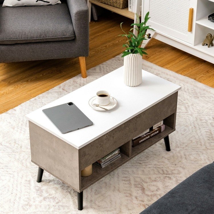 This sturdy multi purpose Mid-Century Lift-Top Coffee Table Sofa Laptop Desk in Grey Wood White Top Finish is a great addition to any sitting space. The top of this modern coffee table can be lifted up, with the durable solid lifting mechanism inside. The lifting mechanism is made of iron, ensuring long-term use. The springs at 2 sides help you to lift the top up and lower down, the height can be fixed at 24 inches to meet your various needs. Under the top, this table hides a large space to store your daily objects. You can put books, magazines, remote controls, keeping them in reach and away from dust. Comes with 3 open shelves at the bottom can collect blankets, toys, or snacks, improving space utilization.
