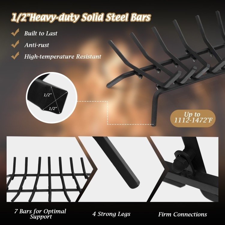Every fire pit/place needs a main squeeze! This heavy-duty iron fireplace grate is a great functional tool to burn firewood of all shapes and sizes. Constructed of high-grade wrought iron with heat-proof coating, the fire grate not only possesses high stability but also resists well to ultra-high temperatures. 7 supporting bars with 1/2" thickness ensures strong load capacity. V-shaped design makes it easier to burn the logs. Raised base ensures good air circulation so firewood can burn for a longer time. This compact fire grate will be a perfect addition to the chimney hearth, fireplace, outdoor fire pit and so on.