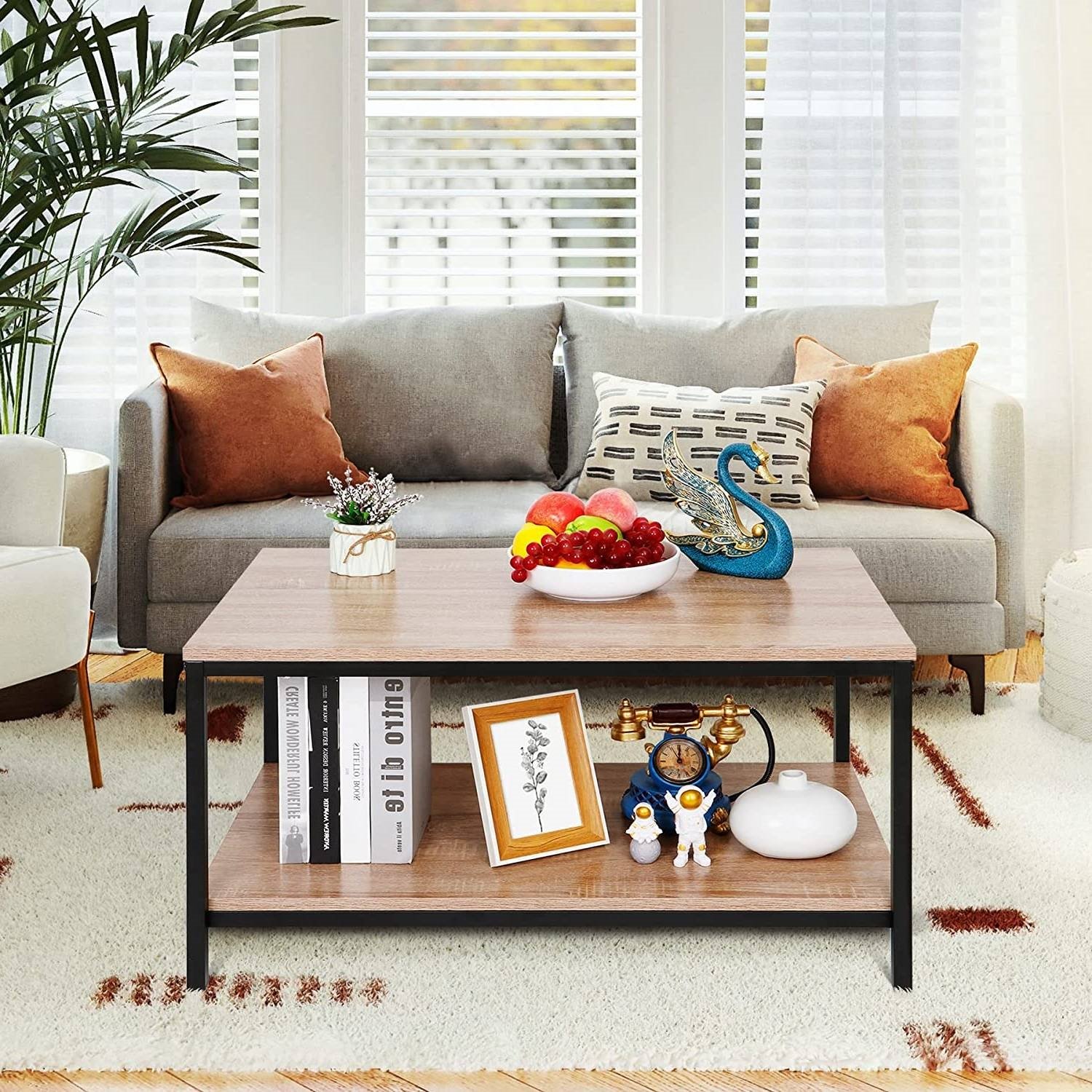 Are you still looking for a stylish yet affordable coffee table for your living room? Then this Modern 2-Tier Metal Wooden Coffee Table in Natural Wood Finish is for you. Our coffee table is sturdy enough to hold up to 132 pounds on top. This handsome table is equipped with a spacious table top, providing you with space to display plants, photo albums, coasters and coffee. The open shelf at the bottom provides additional storage space and helps keep the room clean. This little coffee table is very easy to assemble and is ideal for small spaces or for someone who doesn't want to overwork the available space. It’s the perfect size for small apartment or small living room.