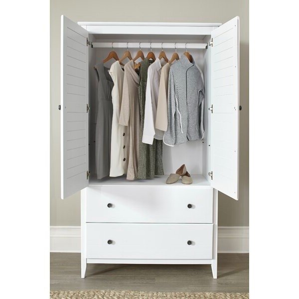 This FarmHome Louvered Distressed White Solid Pine Armoire has what it takes to give your bedroom that refined FarmHome coastal touch. It's modernized traditional style results in a timeless design, while adding lots of storage with 2 large Louvered doors and two spacious 8 1/4” deep drawers. Made of 100% solid pine wood, this customizable wardrobe features a sturdy construction that can lasts.