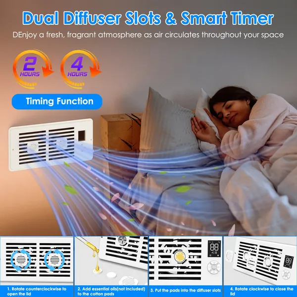 *Smart Temperature & Dual Diffuser Slots*:Featuring automatic temperature detection and dual built-in aroma diffuser slots,this smart register fan lets you add essential oils or perfume(not included) to the included cotton pads. Enjoy a fresh,fragrant atmosphere as air circulates throughout your space.