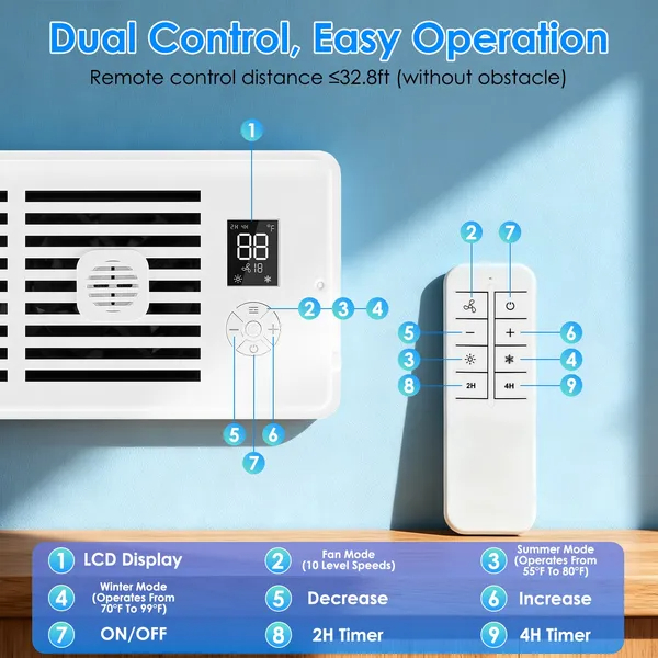 *Smart Remote & LCD Display*:Equipped with 3 modes including:Winter Mode(operates from 70°F to 99°F),Summer Mode(operates from 55°F to 80°F),and Fan Mode(10-level speeds,),and a 2H/4H timer with the full-function remote. The LCD clearly displays temperature and speed,with auto-dimming after 1 minute to prevent nighttime glare.
