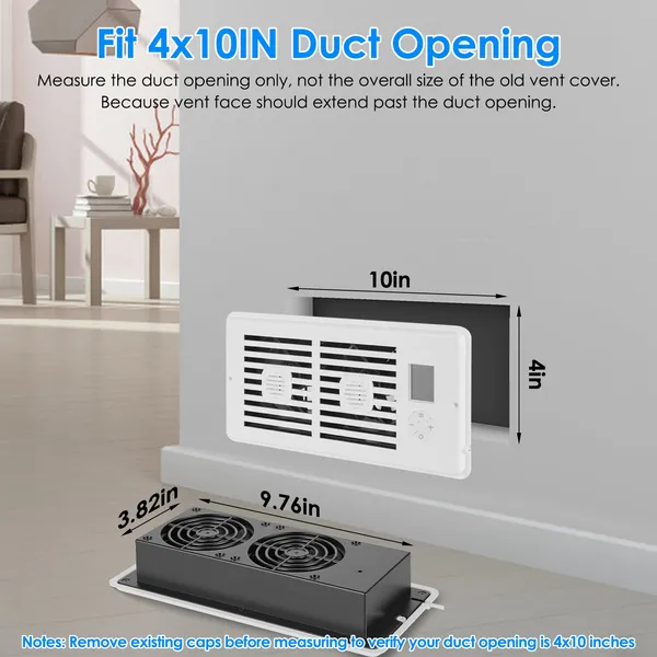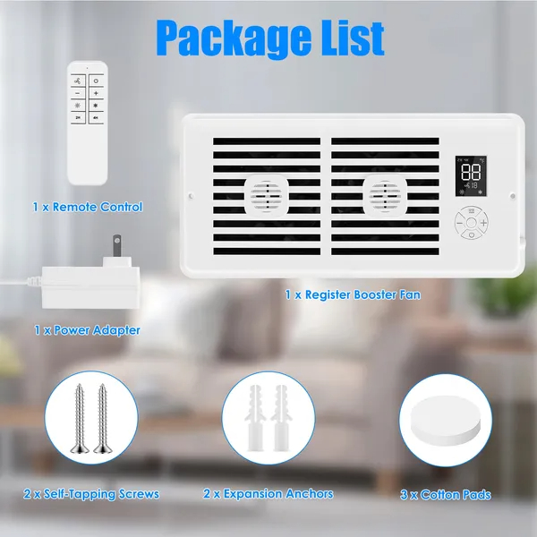 *Complete 4x10 Vent Fan Upgrade Kit*:Includes:1 booster fan,1 adapter,1 remote control,2 screws,2 expansion anchors,3 cotton pads,and a user manual. Everything you need for an easy upgrade to your 4"x10" air vent.
