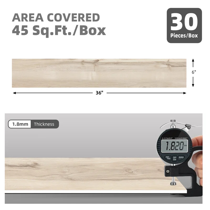 Package Details: Board size: 6 inches wide x 36 inches long x 1.8 mm thick, 30 pieces per pack, covering 45 square feet.