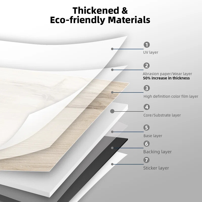 Scratch-Resistant and Wear-Resistant: Our multi-layer structure is firmly bonded with adhesive, making it long-lasting and tear-resistant! It features a white eco-friendly core material with a wear layer thickened by 50%, significantly improving scratch and wear resistance.