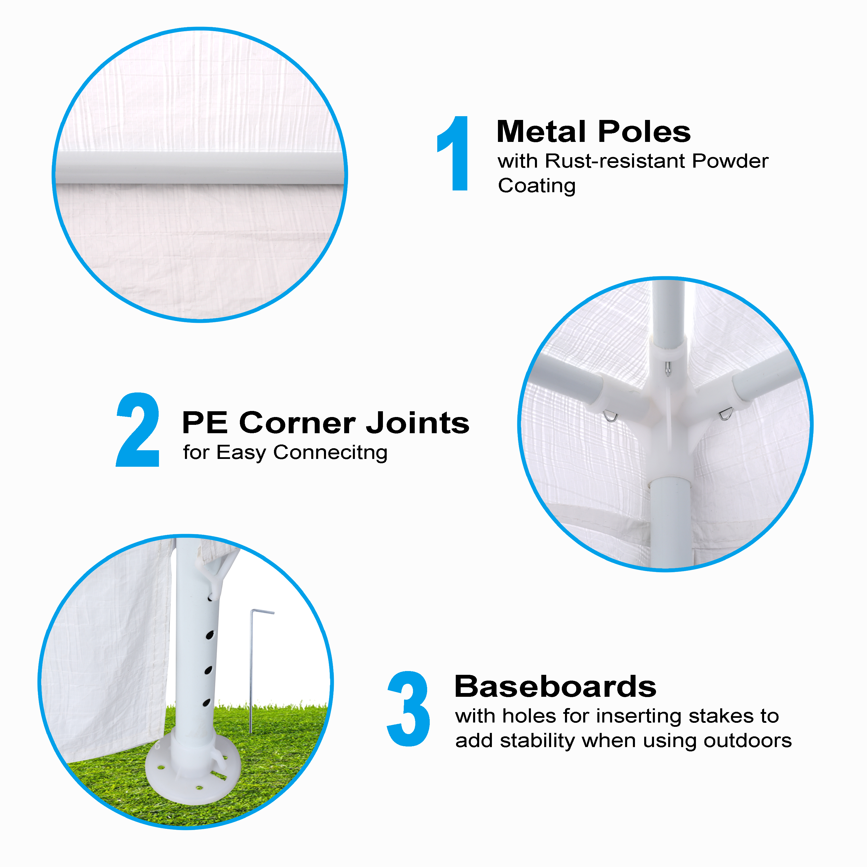 • Stability and Security Features: The tent includes extra straight fittings for stably securing the connection between tubes. The baseboard features holes for inserting stakes to ensure stability when using on the lawn and can be used with sandbags (not included) to add extra stability, ensuring a secure and re