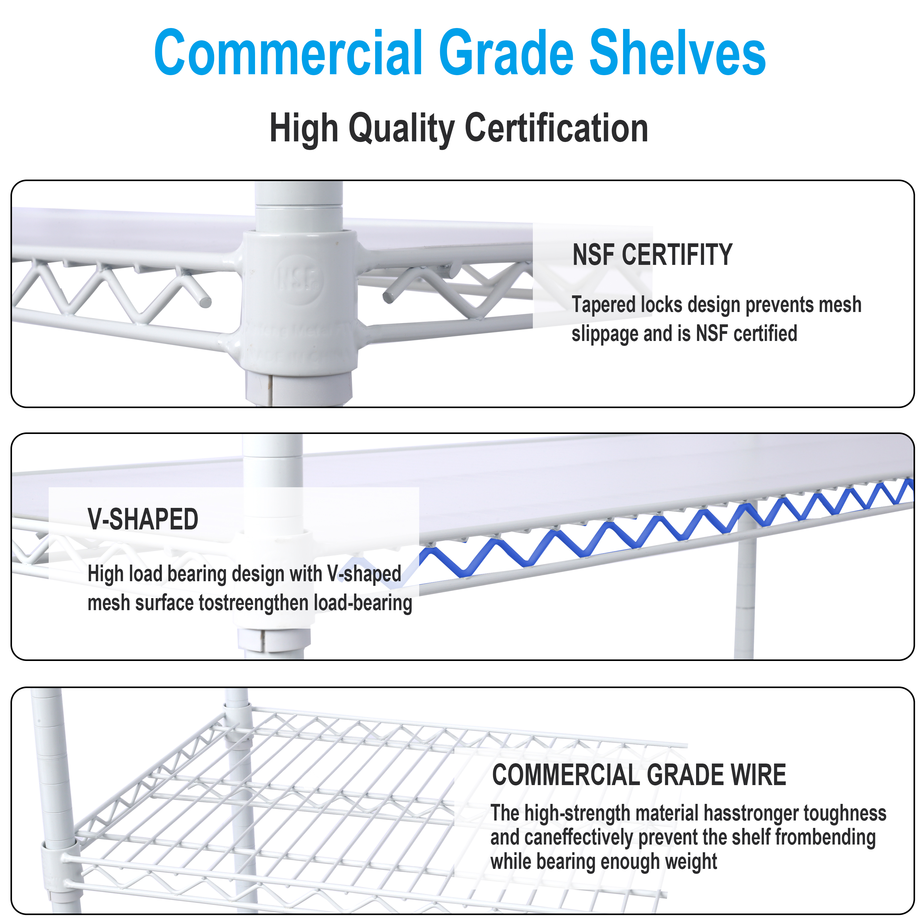 • Sturdy and Durable Construction: Crafted from heavy steel, our wire shelving unit offers excellent rust and oxidation resistance, ensuring long-lasting durability. The shelf liners are of superior quality, thicker than the competition, and the entire unit has passed NSF certification, guaranteeing safety and reliability. This storage rack is the perfect addition to any home or office space.