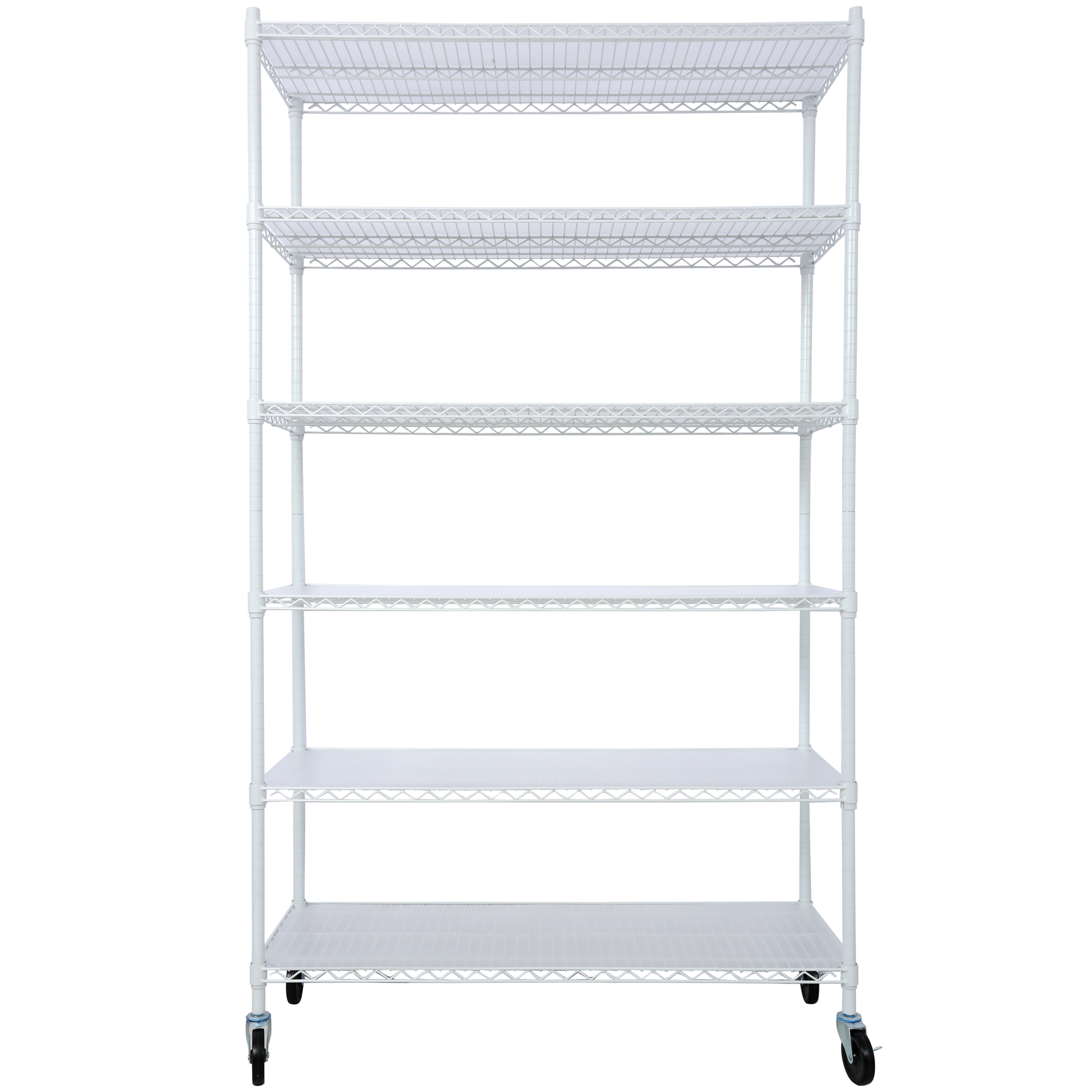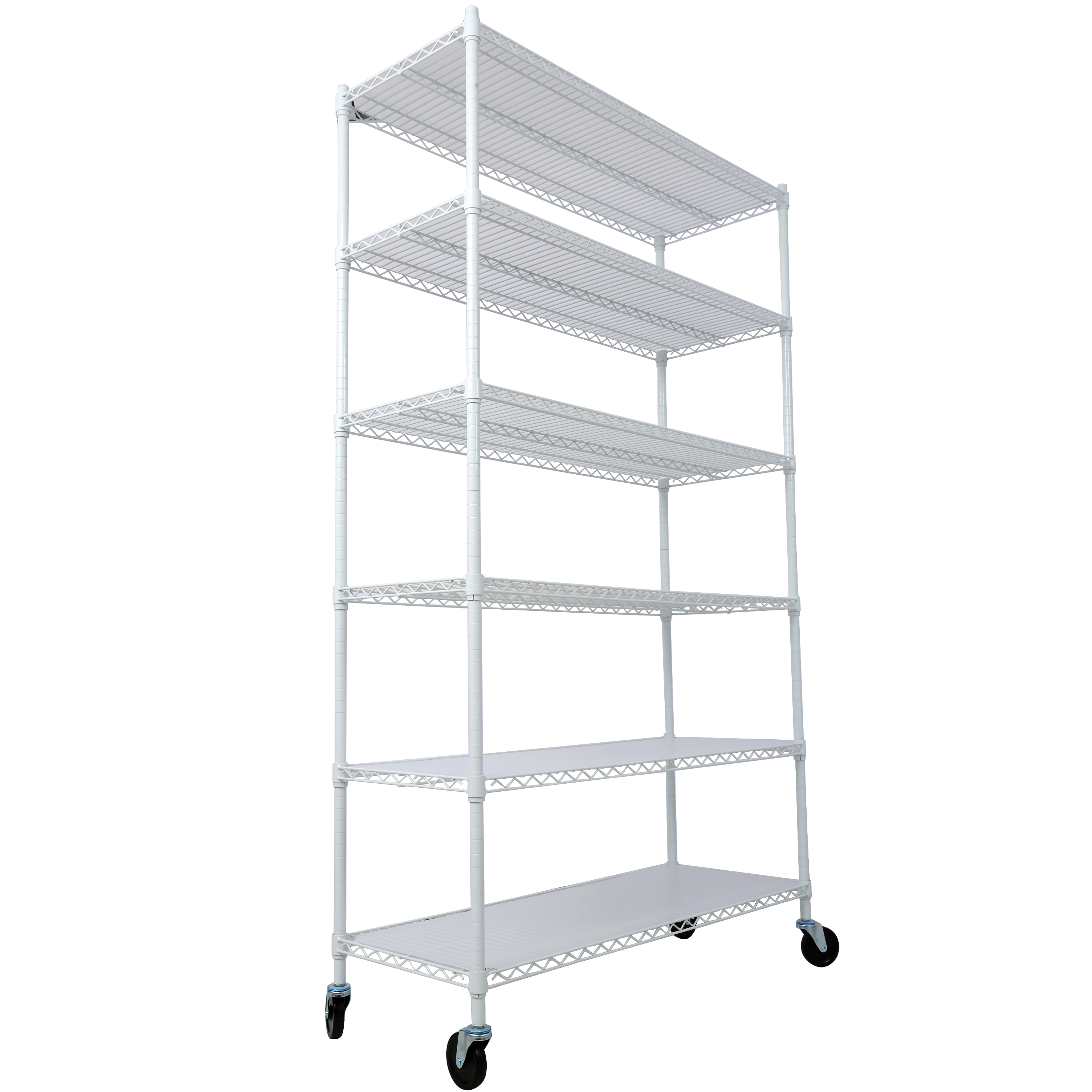 • Heavy-Duty 6 Tier Shelving: Our wire shelving unit features 6 tiers with a large capacity, each shelf capable of holding 1000lbs when equally distributed on feet levelers, for a total maximum load capacity of 6000 lbs. Maximum entire unit weight capacity is 700lbs when equally distributed on caster. The heavy-duty design ensures stability, with the bottom shelf recommended for heavier items